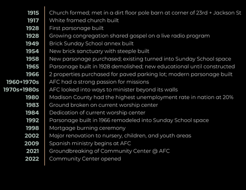 As you explore the timeline and the history of AFC, a few things will probably stand out to you. Many times space has had to be made, built or created in a unique way to handle the growing number of folks wanting to learn and grow in their relationship with Jesus Christ. Discipleship doesn't end with the Sunday sermon, but continues with Sunday School, Bible studies, Small Groups and more.